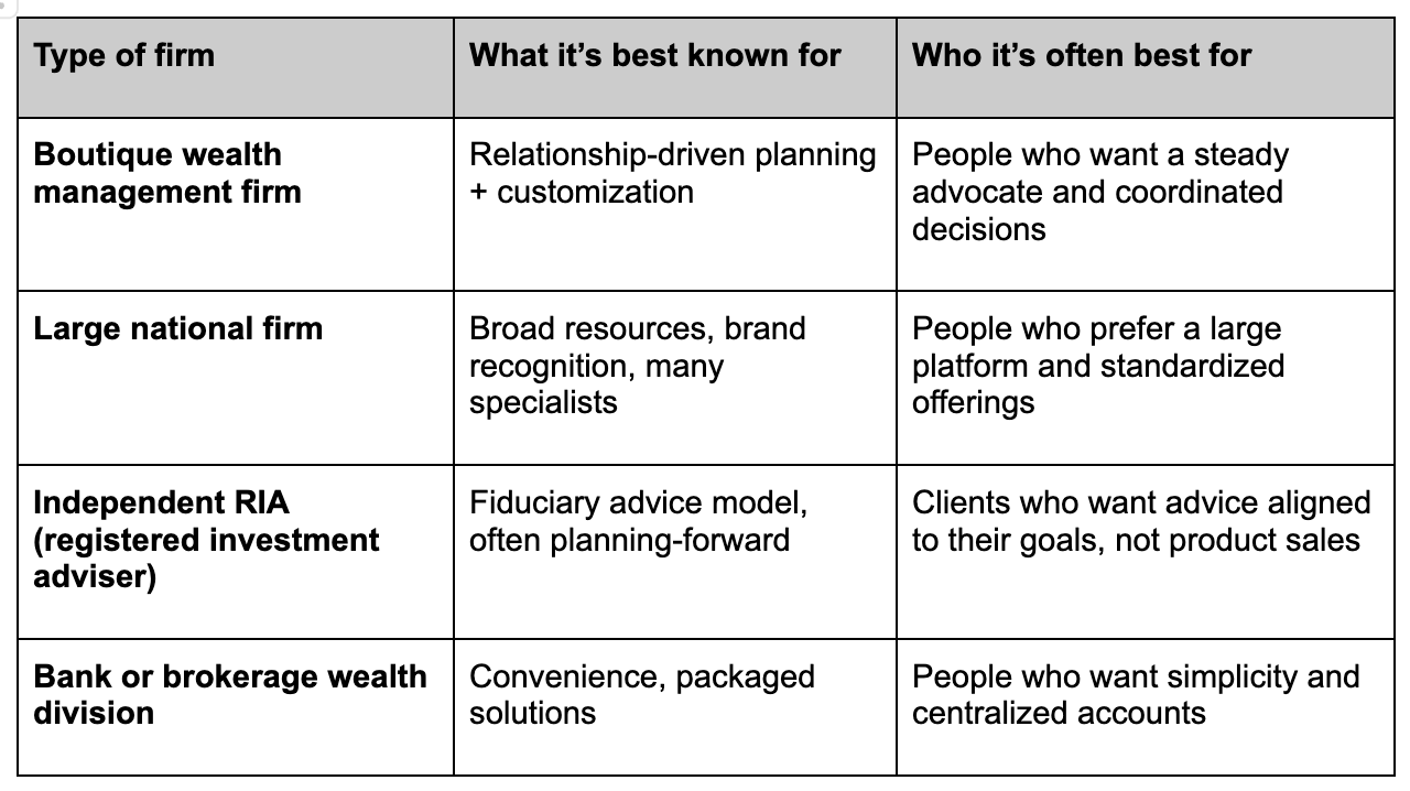 Wealth management companies differ by business model, investment approach, level of planning, and how ongoing the relationship is. This simple comparison table can help you narrow your shortlist quickly.