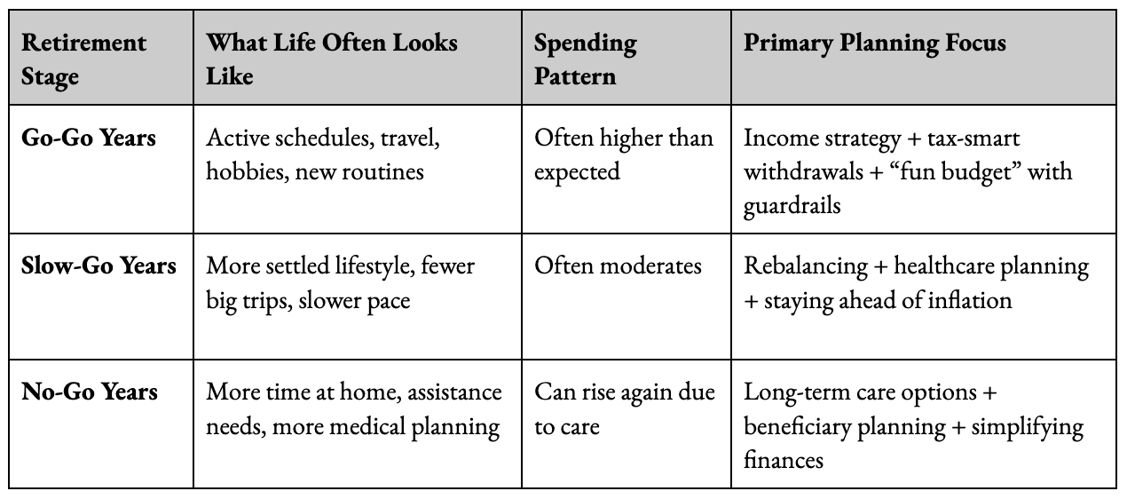 Retirement is not one long, steady season. It changes. Your spending changes, your energy changes, your health needs change, and the way you want to use your time shifts more than most people expect. Smart retirement planning accounts for those changes upfront instead of reacting to them later.
