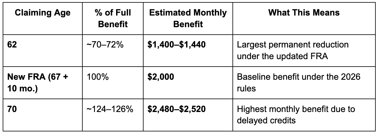 For illustration, we’ll assume this person’s full benefit at their new FRA is $2,000 per month. The table shows how the updated reduction and delayed credit structure translates into real dollars.
